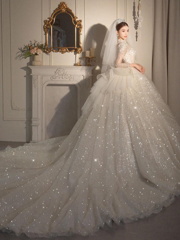 Long Sleeved Retro Bride Luxurious French Wedding Dress For Women