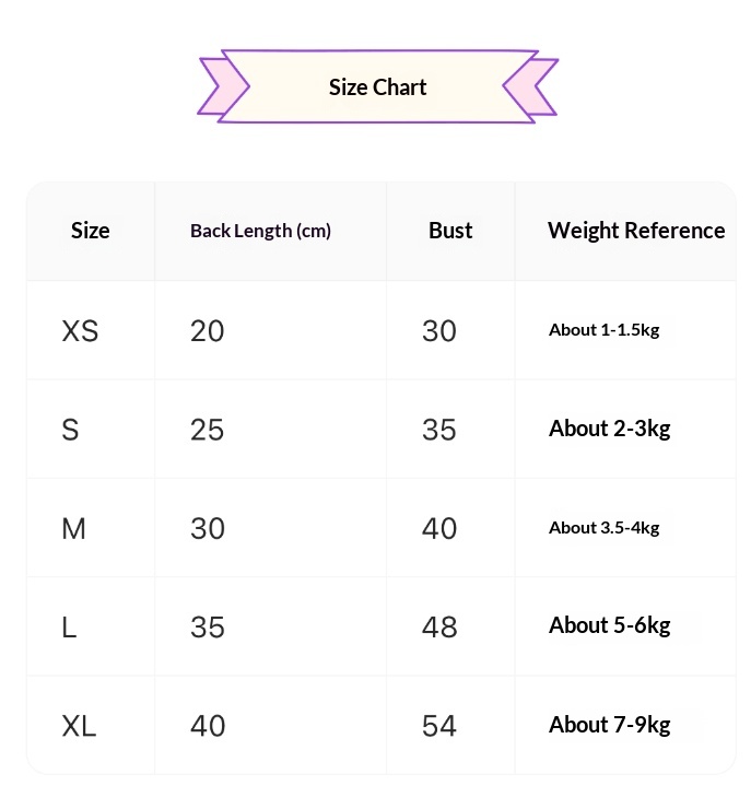 Size: XS – Bust 32, Back length 20cm, Neck circumference 23cm, approximately 1-3 lbs, S – Bust 37, Back length 25cm, Neck circumference 25cm, approximately 3-5 lbs, M – Bust 42, Back length 30cm, Neck circumference 30cm, approximately 5-8 lbs, L – Bust 47, Back length 35cm, Neck circumference 33cm, approximately 8-12 lbs, XL – Bust 52, Back length 40cm, Neck circumference 36cm, approximately 12-16 lbs
